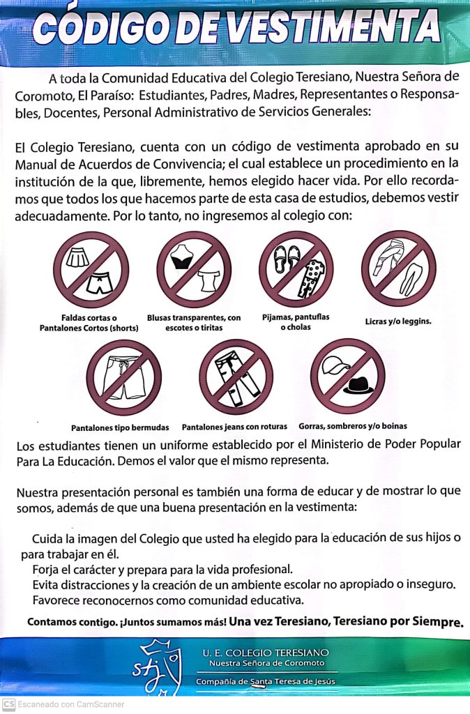 El Colegio Teresiano Nuestra Señora de Coromoto El Paraíso, informa a toda su comunidad educativa, incluyendo estudiantes, padres, representantes, docentes y personal administrativo, sobre la importancia de cumplir con el Código de Vestimenta establecido en el Manual de Acuerdos de Convivencia y Paz.